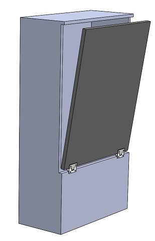 Vertical lid. Hinge on bottom. In the closed position the lid is up vertical. The lid can move from vertical to an oblique line under the hinge. The Gas spring is mounted on the lid and on the area under the hinge.